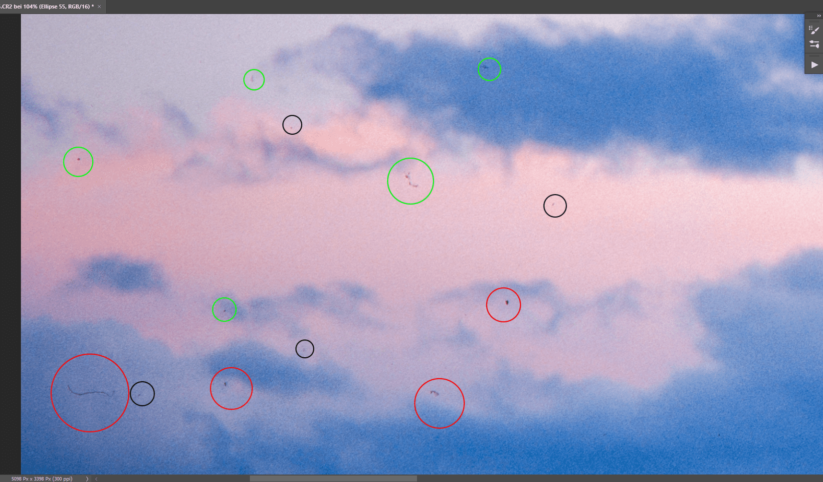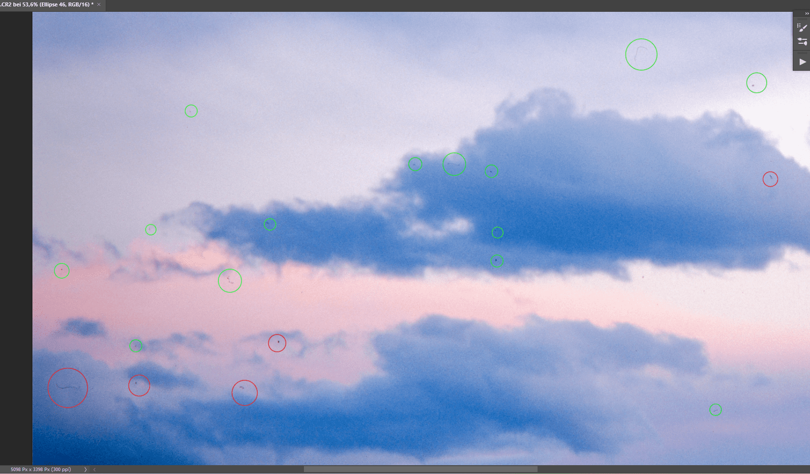Gleichmäßige und kontrastarme Bildflächen (Himmel) lassen sich mit dem Plugin sehr gut und schnell retuschieren. Bei detailreichen und stark strukturierten Bildelementen würden durch die Software aber auch kleine Details, Schatten, feine Linien etc. entfernt. Somit nehme ich für diese Bilder bzw. Bildbereiche eine optische Sichtung und manuelle Retusche vor.