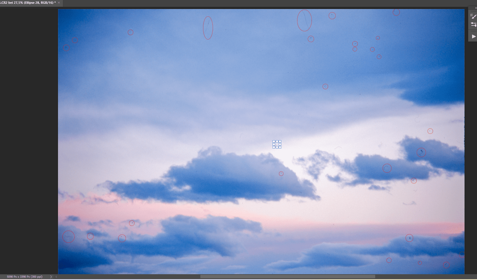 Diese Bereinigung bezieht sich auf die Entfernung gröberer Punkte und Haarlinien, die sich in einer normalen Vollbildschirmansicht (ca. 25 - 50% der vollen Bildgröße) störend bemerkbar machen würden. Wenn du das Bild für großformatige Drucke oder andere hochwertige Anwendungen brauchst, musst du eventuell für eine weitere Detailbereinigung kleinster Staubpartikel selbst sorgen.