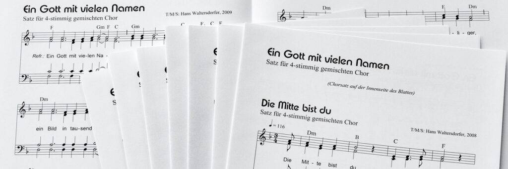 Das Hauptlied meines aktuellen Liederbuches in einer für Chorsänger gut lesbaren großformatigen Ausgabe (Text der Strophen übersichtlich unter den Noten). Dazu ein kurzer meditativer Gesang, ebenfalls aus meinem aktuellen Liederbuch.