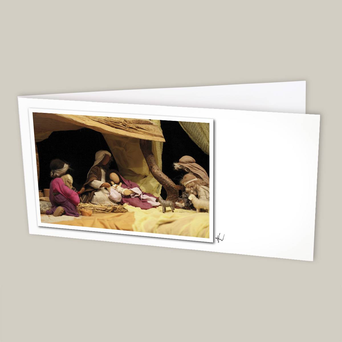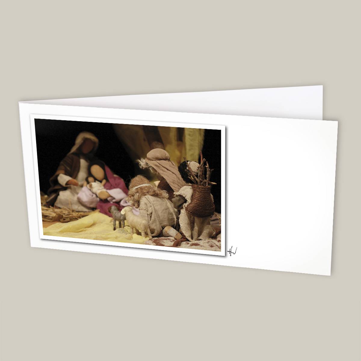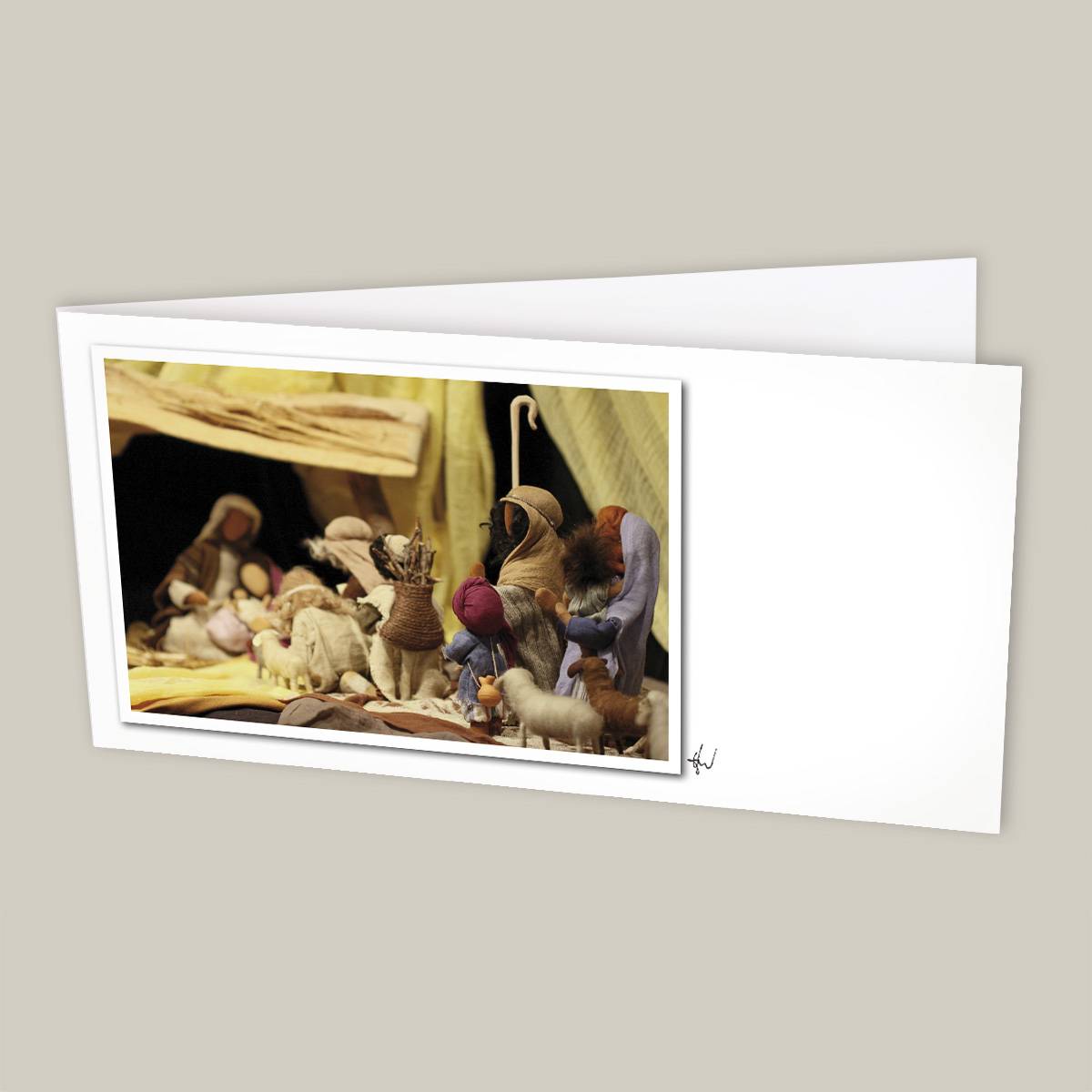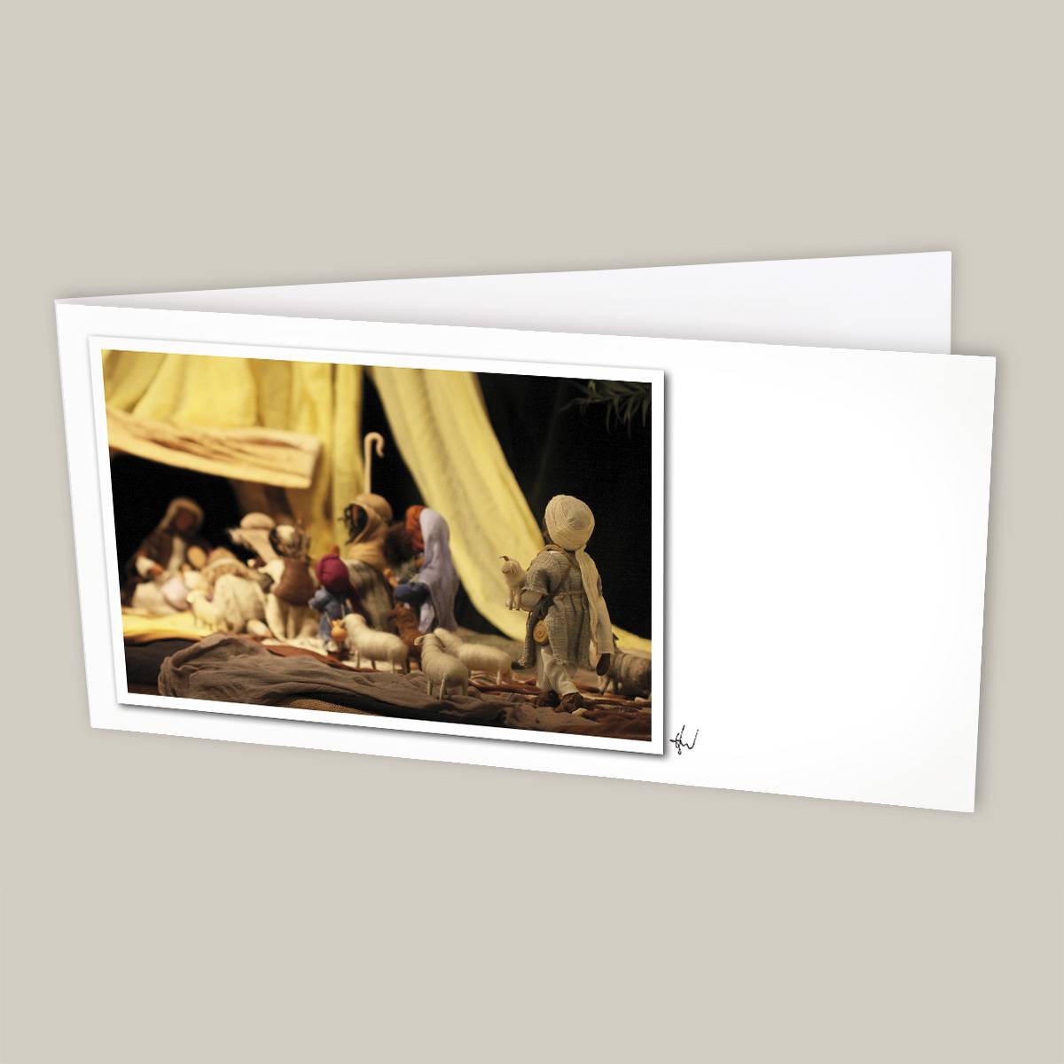 Entwürfe für Weihnachtsbillets mit Krippenszenen mit Biblischen Erzählfiguren von Lisi Waltersdorfer – mit oder ohne aufgedruckten Weihnachtswunsch; eigener Wunschtext möglich.