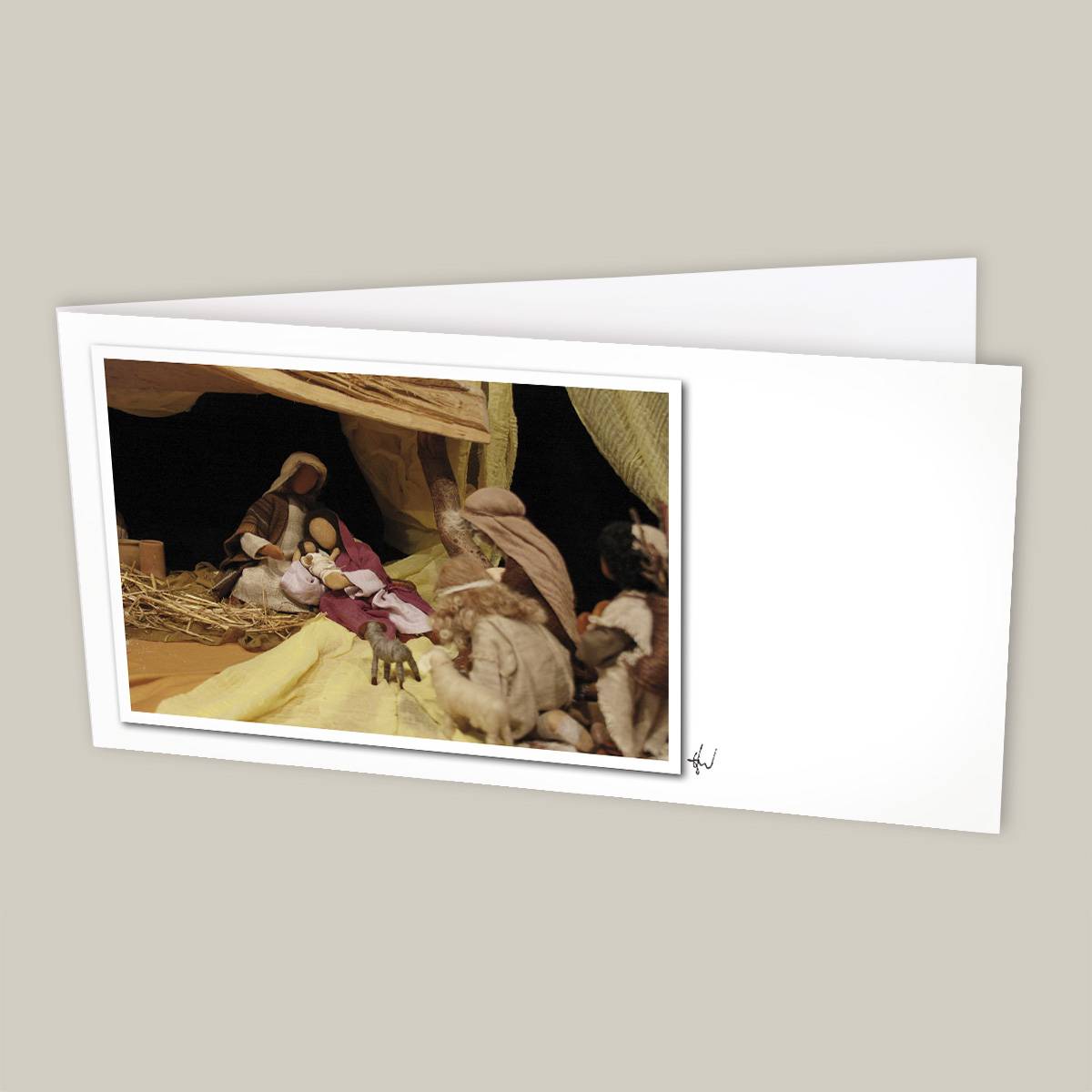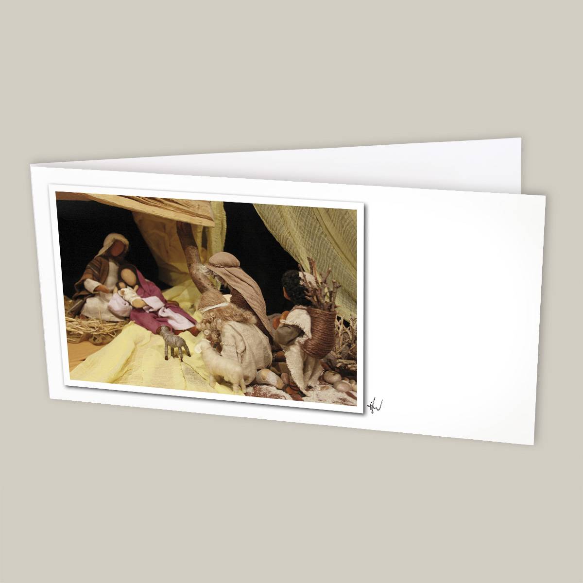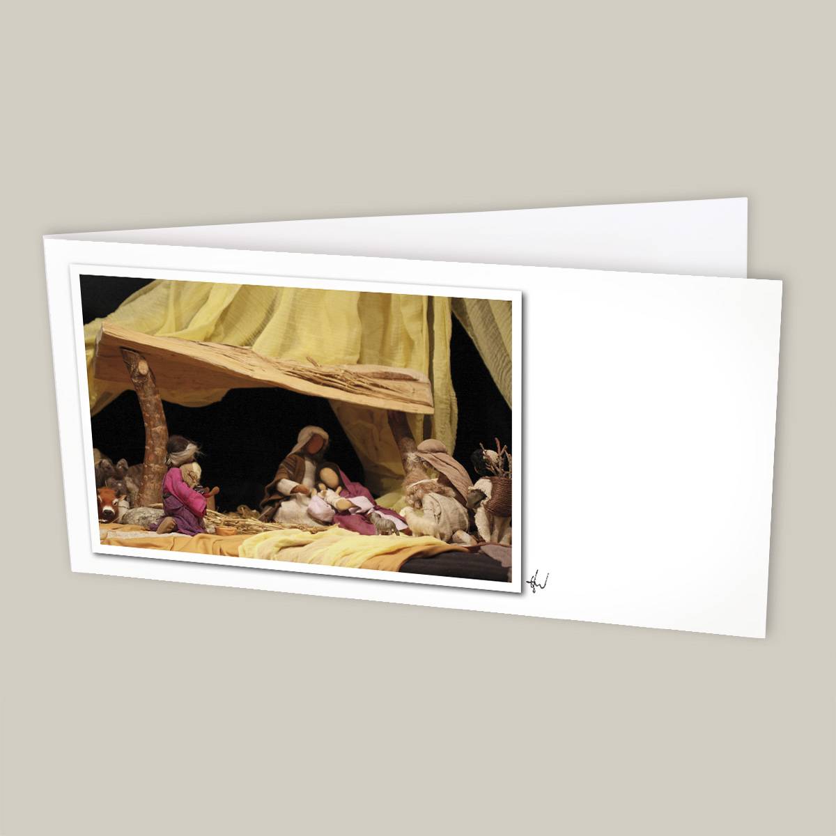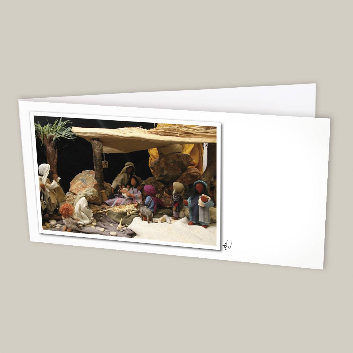 Entwürfe für Weihnachtsbillets mit Krippenszenen mit Biblischen Erzählfiguren von Lisi Waltersdorfer – mit oder ohne aufgedruckten Weihnachtswunsch; eigener Wunschtext möglich.