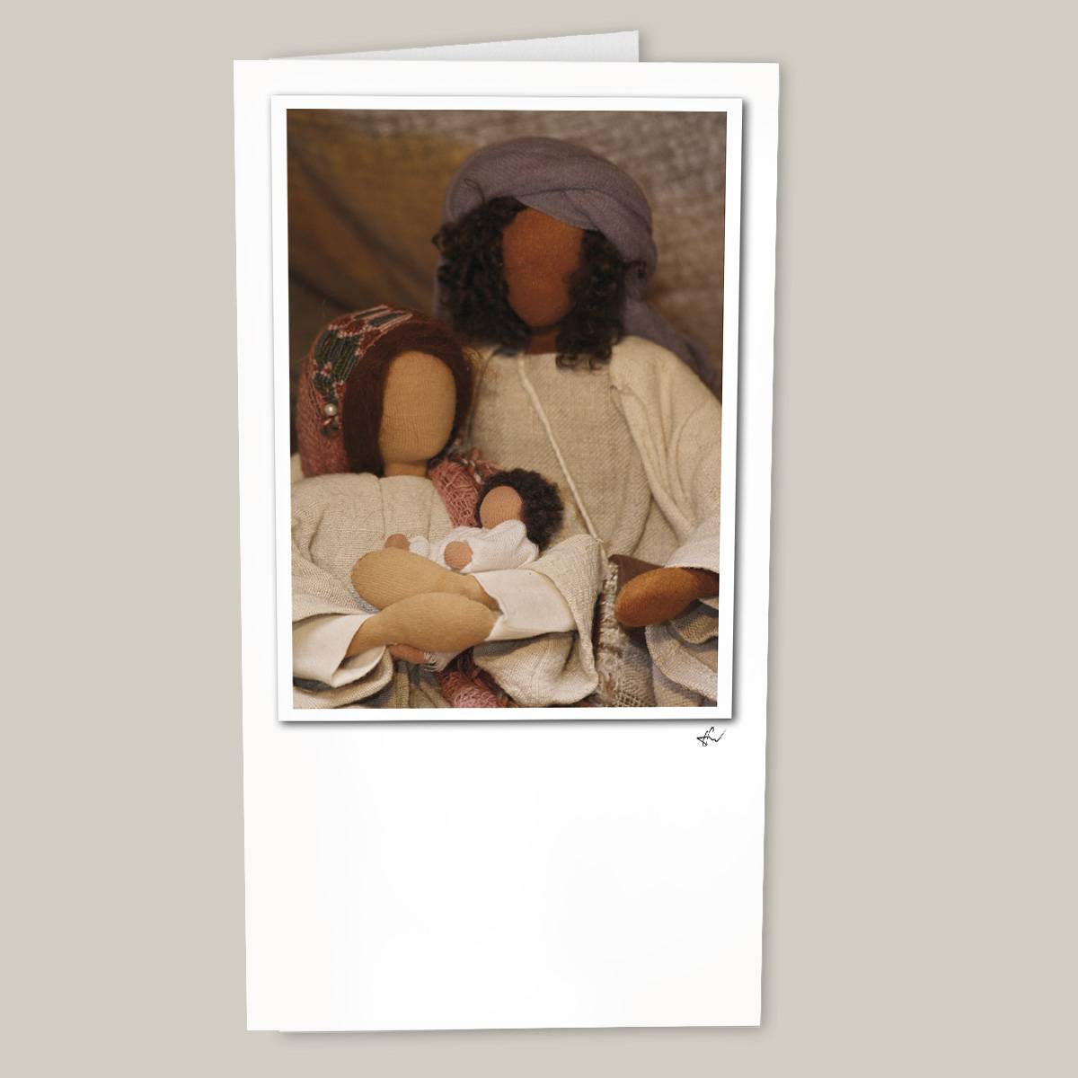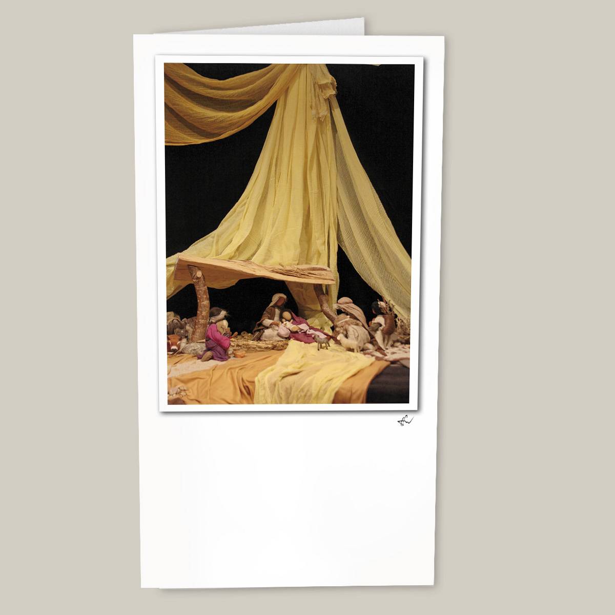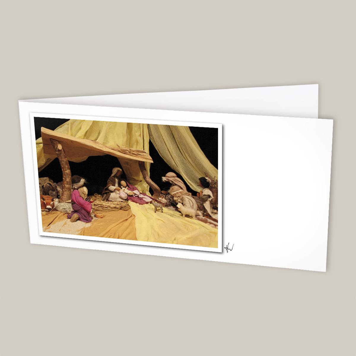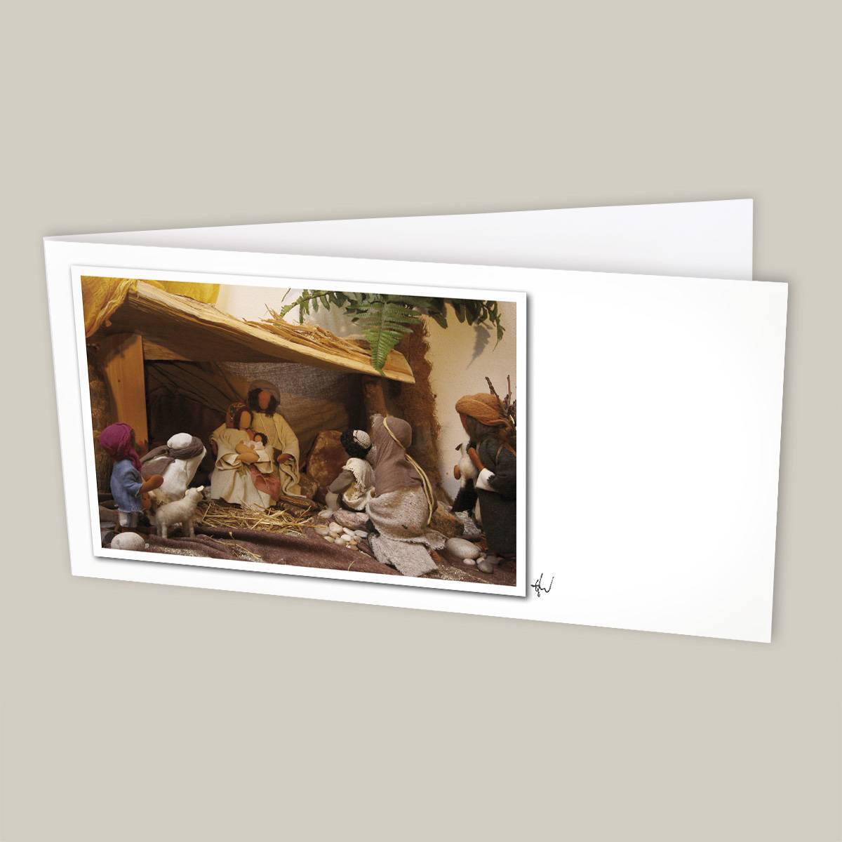 Entwürfe für Weihnachtsbillets mit Krippenszenen mit Biblischen Erzählfiguren von Lisi Waltersdorfer – mit oder ohne aufgedruckten Weihnachtswunsch; eigener Wunschtext möglich.